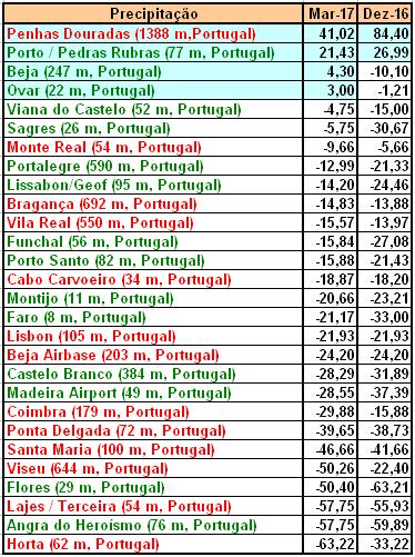 Os quadros acima referem-se aos acumulados ocorridos durante os últimos doze meses (entre 1 de Abril de 2016 e 31 de Março de 2017) e indicam as estações meteorológicas que registaram os maiores desvios relativamente aos valores normais registados em cada estação.