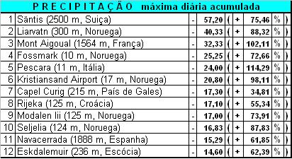 No que se refere às dez estações meteorológicas em que a acumulação de precipitação máxima diária, ao longo dos últimos doze, foi mais elevada que o normal (mais húmido), destaque para Mont Aigoual (1564 m, França), Forde-Vie (64 m, Noruega), Säntis (2500 m, Suiça), Fossmark (10 m, Noruega), Lago di Robièi (1891 m, Suiça) e